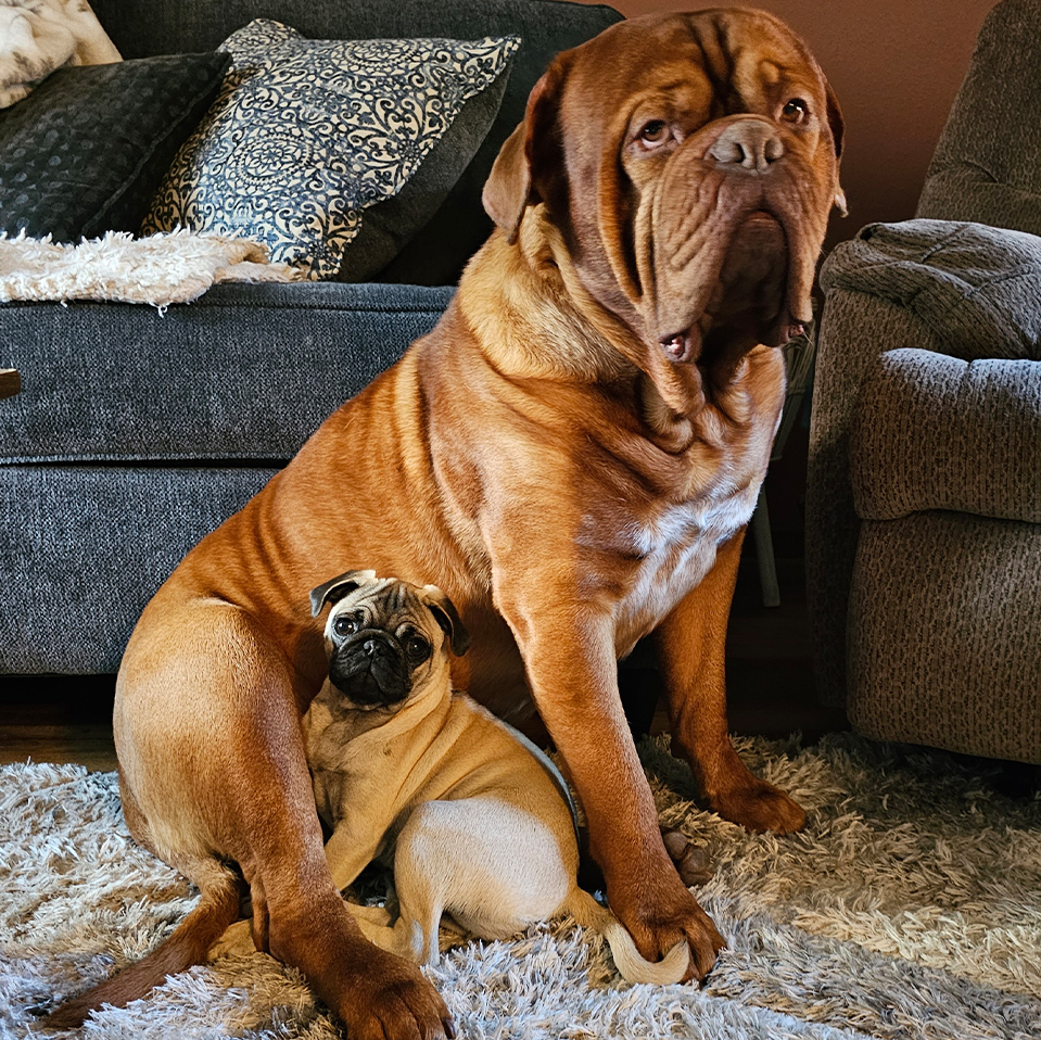 Bear is a 7-year-old Dogue de Bordeaux, and Luna is a 1-year-old Pug. Together, they make an extremely comical and loving pair: many laughs and good times.