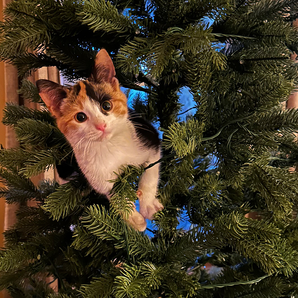 No good Christmas tree goes untouched by new kitty Pippi. Our daughter’s tree was only up a short time before the three-pound tiny terror found a home in it. She’s very proud of herself.