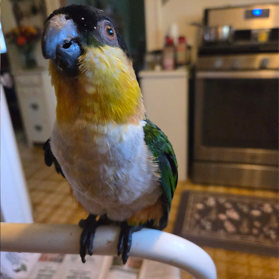 Hawkeye is about 30 years old. He is a Black Headed Caique (kai-yeek). Loves cheese
